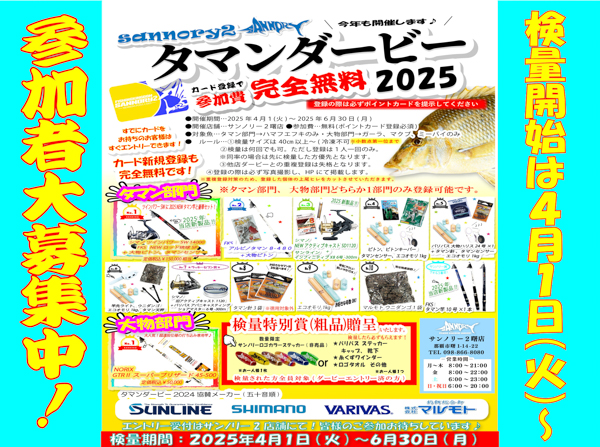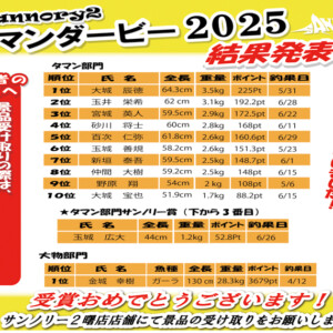タマンダービー参加者募集中! 2025.04.06 タマンダービー コメント: 0 新商品 琉球タマンスペシャル8号500入荷! サンノリー2 創業26周年感謝祭SALE開催中! 関連記事一覧 2025タマンダービー結果発表! 2025.07.06