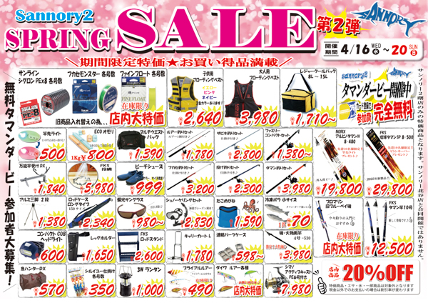 SPRING SALE 第2弾開催中!明日まで! 2025.04.19 SALE コメント: 0 釣果情報 タマン 釣果情報 アオリイカ 関連記事一覧 年末大感謝祭開催中! 2025.12.04 シマノ・ダイワの竿・リールが5%引き 2025.04.07 サンノリー2 創業26周年感謝祭SALE開催中! 2025.04.07 8/24(日)一日限定!沖縄尚学優勝記念セール! 2025.08.24 サンノリー サマーセール開催中 8/11(月)まで! 2025.08.04