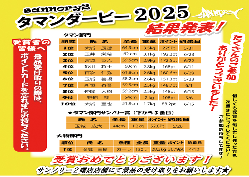 2025タマンダービー結果発表! 2025.07.06 タマンダービー コメント: 0 釣果情報 タマン Fishmanロッド大展示会開催のお知らせ 関連記事一覧 タマンダービー参加者募集中! 2025.04.06